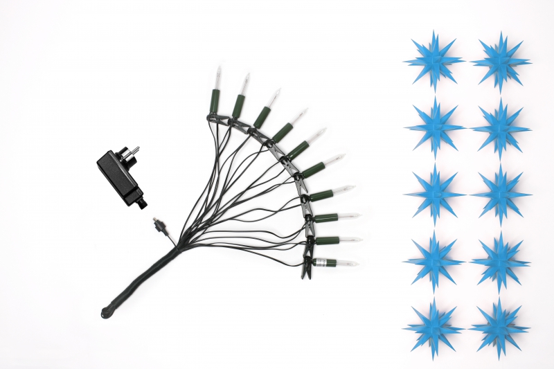 Řetěz malých adventních hvězd z umělé hmoty s 10 hvězdami o Ø cca 13 cm. Určeno pro vnitřní i venkovní dekoraci - elektroinstalace řetězu je odolná povětrnostním vlivům, vlhku a mokru.